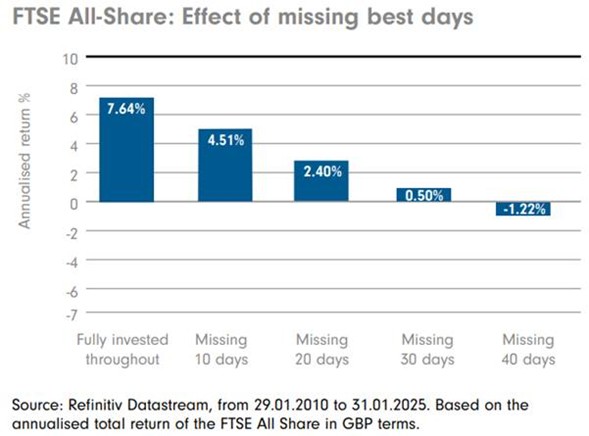 The chart below illustrates this and shows how longer-term returns can be severely negatively impacted by being out of the market for even short periods of time. The chart shows the annualised returns when investing in the FTSE All Share Index over 15 years from 2010 to the beginning of 2025 when remaining invested throughout and then if the best days of market performance were missed by attempting to time the market.